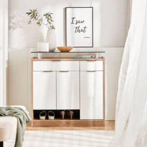 رتبي أحذيّتك بدقة في خزانة الأحذية العصرية هذه. مصمّمة بمساحة واسعة بأدراج وخزائن فسيحة لتنظيم أحذيتك الجميلة والأشياء الثمينة الأخرى. تتميّز بلمسة نهائية شديدة اللمعان بسطح زجاجي لعرض التماثيل الزخرفية. كما أنها مصنوعة من الخشب المتين المصمم هندسيًا، ما يضمن متانتها واستدامتها.