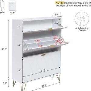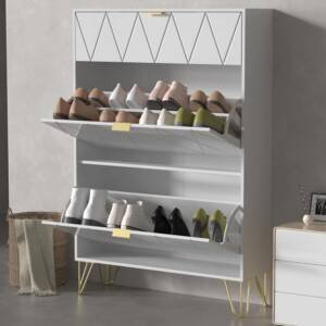حافظ على أحذيتك منظمة وبعيدة عن الأرض مع خزانة الأحذية العصرية هذه. مصنوع من خشب MDF قوي، ويتميز بثلاثة أرفف ودرجين للتخزين مما يجعله مثاليًا للحفاظ على أحذيتك المفضلة آمنة. يضفي الإطار الذهبي لمسة من الأناقة والرقي، بينما يضفي اللون الأبيض إحساسًا بالانتعاش على أي غرفة. بفضل سعتها التخزينية الكبيرة، من المؤكد أن خزانة الأحذية هذه ستجعل جميع أحذيتك منظمة ويسهل الوصول إليها!