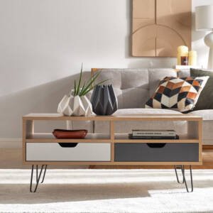 أضافة لمسة راقية إلى ديكور المنزل باقتناء طاولة القهوة الجذّابة تلك. بتصميم متقن بقوائم معدنيّة سادة وبأدراج لمساحة تخزين عملية، مع تشطيب ميلامين لسهولة التنظيف. جميلة وتعكس رقي اختياراتكِ.