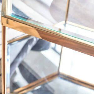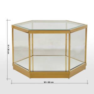 إضافة رائعة الى غرفة المعيشة خاصتك تتمثل في طاولة القهوة هذه ذات التصميم العصري الأنيق. مصنوعة من الفولاذ المقاوم للصدأ كما تأتي بشكل سداسي أنيق بسطح زجاجي يعزز من مظهرها العام.