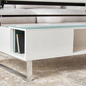 أضفي جاذبية منعشة على ديكور منزلك بإضافة هذه الطاولة الرّائعة. مصمّمة بنمط عصري ومزودة بآلية رفع وأرجل معدنية تضفي قوة وصلابة لهذه الطاولة. مصنوعة من خامات عالية الجودة بلمسة نهائية عالية اللمعان تجعل من السهل تنظيفها. أنيقة ومزودة بمساحة تخزين جيدة لاستيعاب العديد من العناصر والمقتنيات.