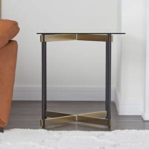 أكملي تشكيلة قطع الأثاث الفاخرة في منزلك بالحصول على هذه الطاولة الجانبية الجذابة. مصممة بسطح من الزجاج المعالج حراريًا وبقاعدة معدنية تعزز من متانتها، كما أنها مصممة بتشطيب مطلي يلائم الديكورات الفخمة. امسحيها برفق للاعتناء بها.