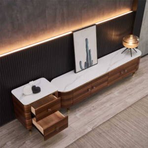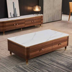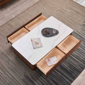 يتميز طقم الطاولات بسطح مفتوح وعددة ادراج مع تصميم عصري وحديث . وتتميز بلمسة نهائية محايدة تنسق مع أي ديكور تقريبًا ، كما أنها مصنوعة من خشب الزان ورخام الصناعي والأرجل الصلبة الخشبية لتكمل البنية القوية إلى جانب تصميم ممتع.