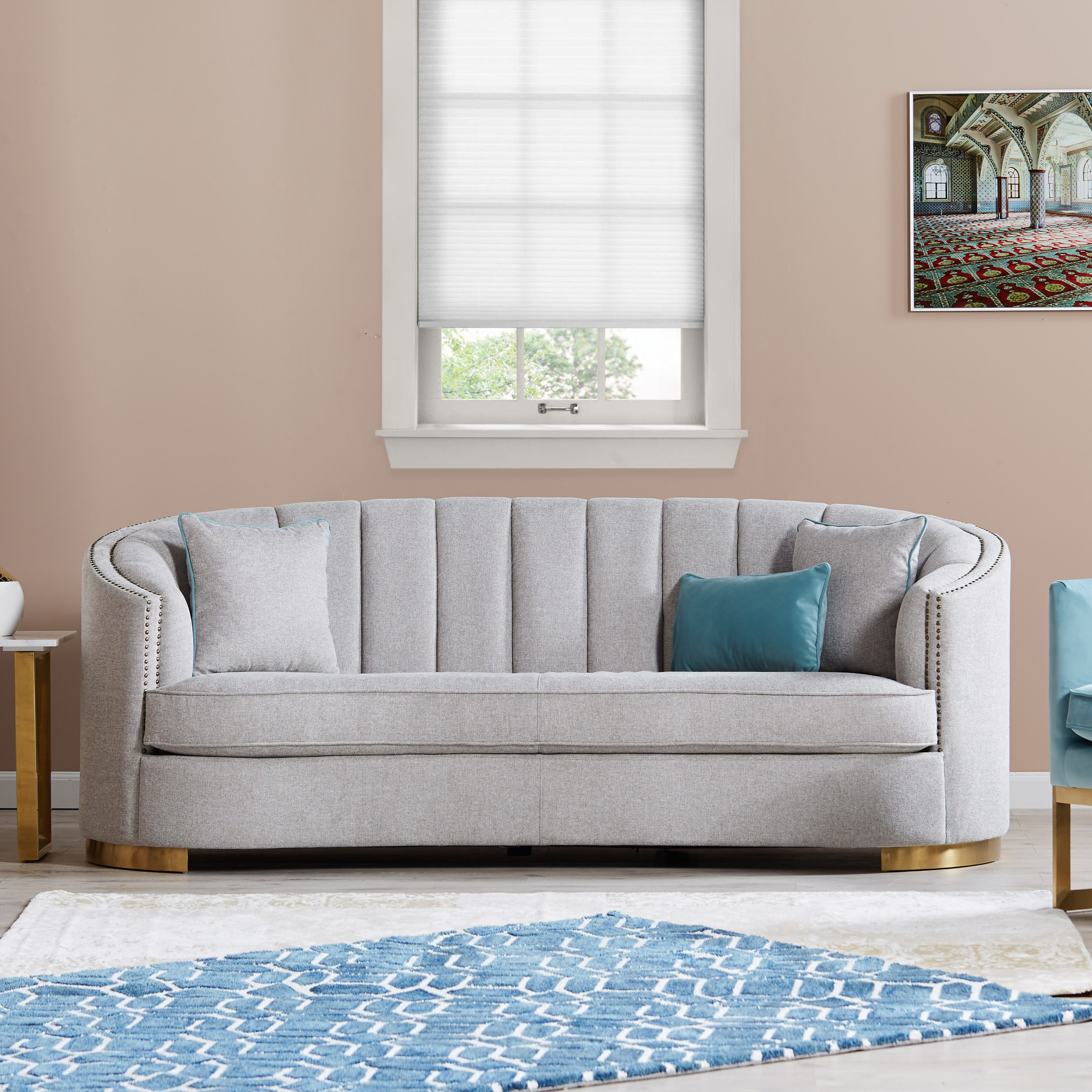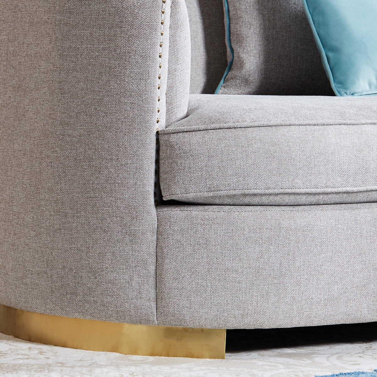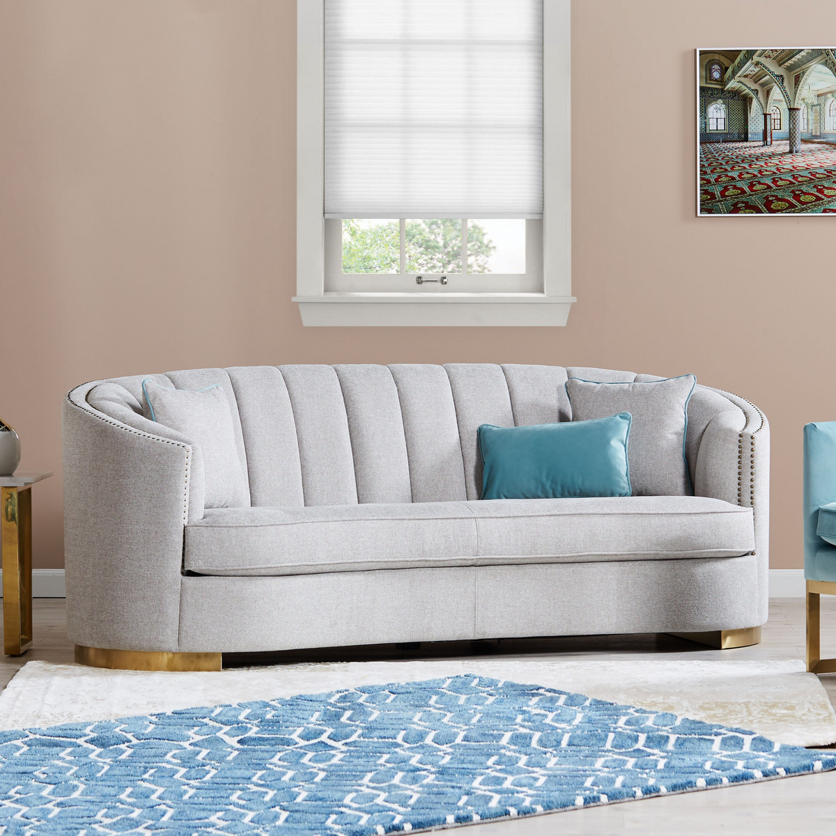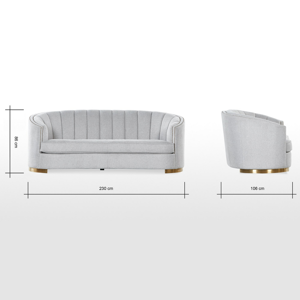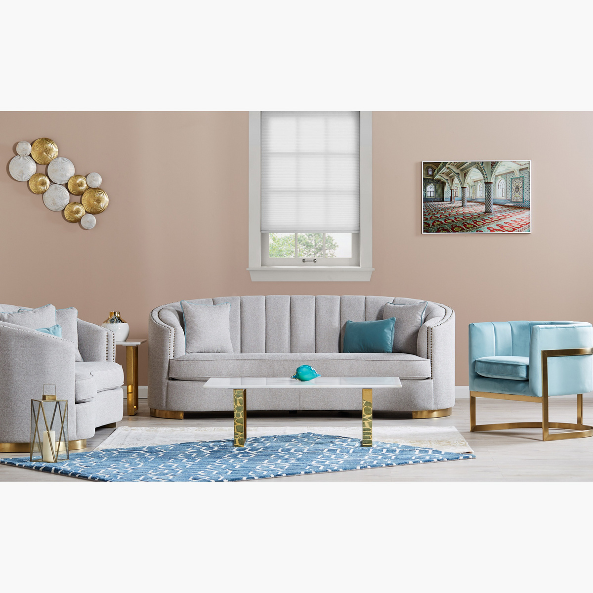 تمتعي بالراحة التامة في غرفة معيشتك باقتناء هذه الكنبة الراقية، مصممة بتفاصيل معنقدة، تضفي مزيدًا من الجاذبية عليها، مصممة بثلاثة مقاعد تسع التجمعات العائلية، مصنوعة من المعدن المتين بأرجل ذهبية ساحرة، ذات تنجيد من لقماش الفاخر، سهلة التنظيف بالطريقة الاحترافية.