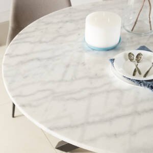 أضيفي لمسة بسيطة وأنيقة لغرفة طعامكِ باقتناء هذه الطاولة المستديرة المصمّمة لاستيعاب 4 كراسي. تأتي بسطح رخامي لامع، وأرجل معدنية متينة و قوية مما يعزز من جمالها ومتانتها. ويمكن تنظيفها بمسحة بسيطة للحفاظ على رونقها.