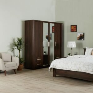 استكملي أناقة غرفة نومكِ باقتناء خزانة الملابس الرائعة هذه، مصممة بأربعة أبواب وأرفف قابلة للتعديل وأدراج بمساحة متسعة ومرآة تعزز من فائدتها، ومصنوعة من خامة متينة لضمان الاستدامة.