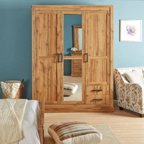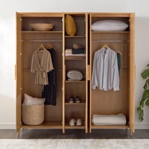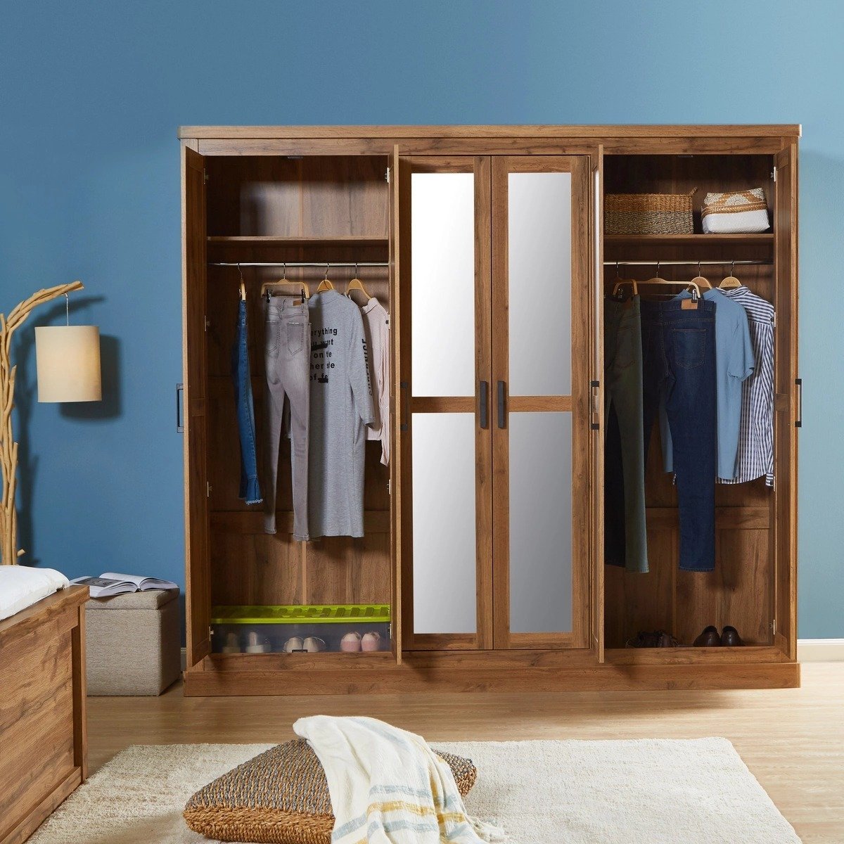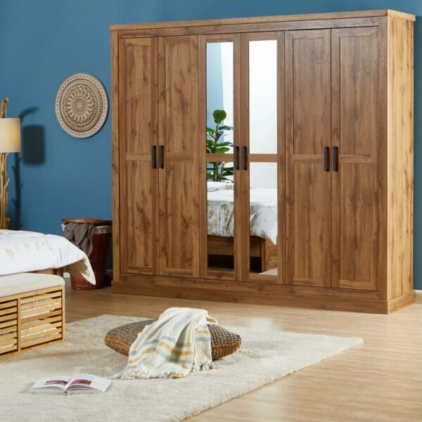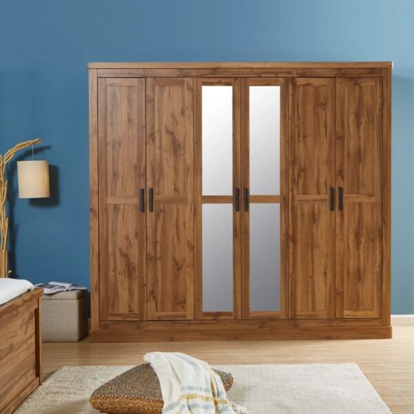 رتّبي مختلف الملابس والإكسسوارات بشكل أنيق مع خزانة الملابس الأنيقة هذه، مصنوعة من الخشب الهندسي، متينة وتتّمتع بستة أبواب بها مساحة وفيرة تستوعب العديد من الأغراض. بالإضافة إلى أنّها تتمتّع بمرايا مستطيلة ولون خشبي متوسط يمنحها مظهرًا مصقولًا لافتًا.