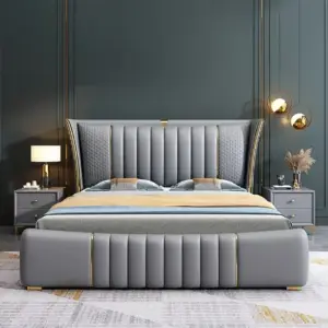 يتميز السرير بتصميم حديث يعمل بشكل جيد. يتمتع بلمسة نهائية محايدة تنسق مع أي ديكور تقريبًا. مصنوع من خشب هندسي وخشب زان روماني عالي الجودة، مغطى بالجلد المصنع الإيطالي ليمنحه الفخامة والرقي، مبطن بالإسفنج عالي الكثافة إلى جانب تصميم ممتع.