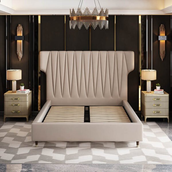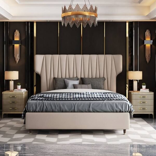 هيكل السرير من خشب الصنوبر المتين بسمك كبير لقوة تحمل عالية مع ثبات قوي للمنتج أقدام السرير من خشب البلوط العتيق بسمك عالي لثبات قوي مع قوة تحمل عالية تصميم السرير من الجلد المطرز بعناية ودقة بمظهر فاخر وفخم مبطن بطبقة عالية الكثافة من الاسفنج المرن لراحة عالية عند الاسترخاء والنوم مظهر وتصميم السرير فاخر وأكث من رائع ومناسب لغرفة النوم الفاخرة الخاصة بك منتج عالي الجودة بخامات ممتازة وتصميم فاخر