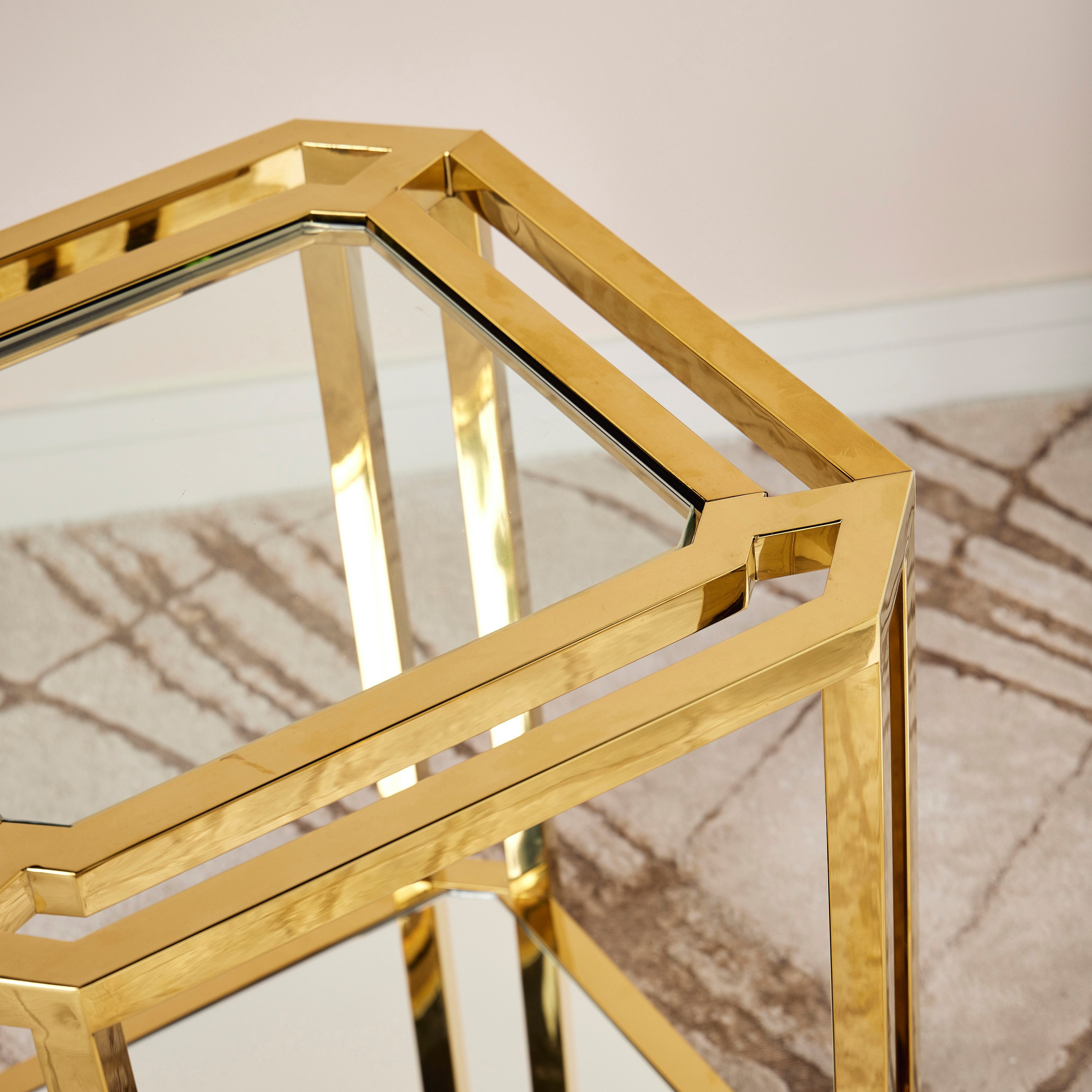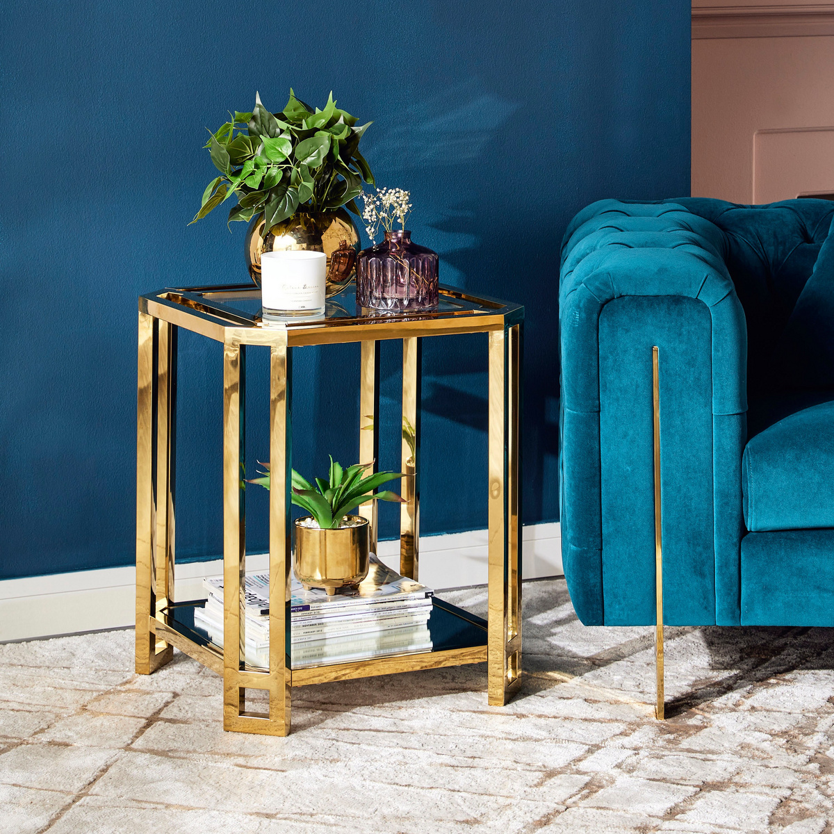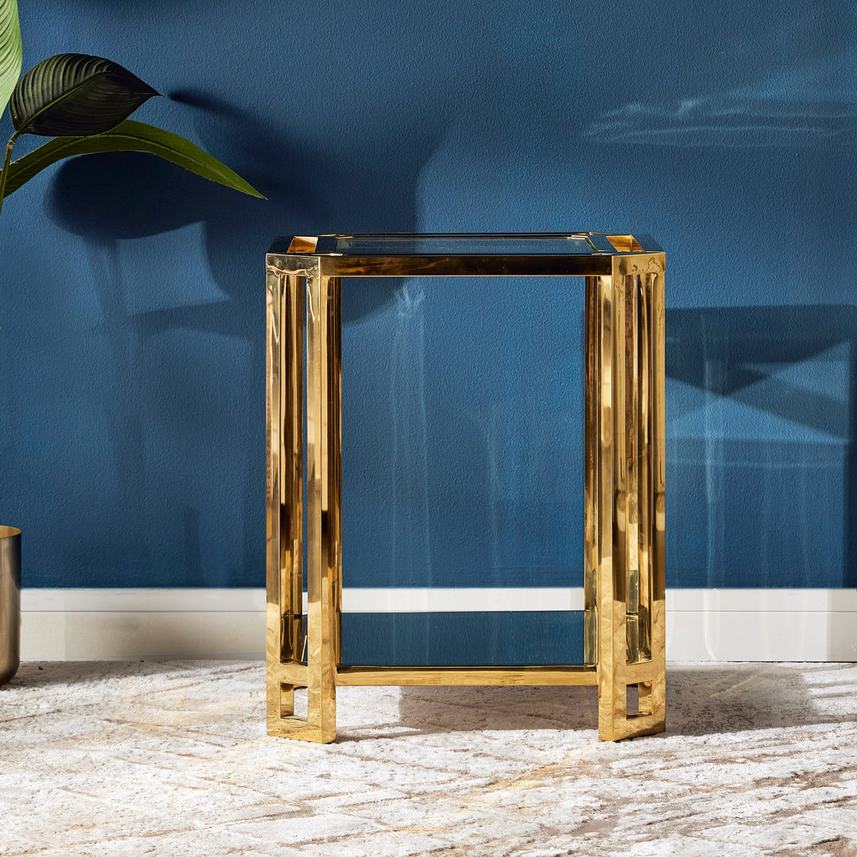أضيفي لمسة راقية إلى ديكور المنزل باقتناء هذه الطاولة الجانبية الفاخرة. مصممة بنمط عصري، مصنوعة من خامات عالية الجودة بقوائم معدنية وسطح من الزجاج لضمان المتانة، كما تأتي بشكل جميل يجعلها قطعة ديكور مميّزة.