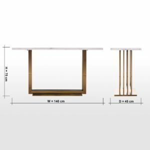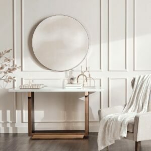 امنح مساحة معيشتك لمسة ملكية باقتناء طاولة كونسول الجذابة هذه. تأتي بمرآة وتشطيب رخامي ومصقول يعزز من جاذبية التصميم، كما أنها مصنوعة من المعدن المتين الذي يعزز من جودتها؛ امسحيها برفق للاعتناء بلمعانها.