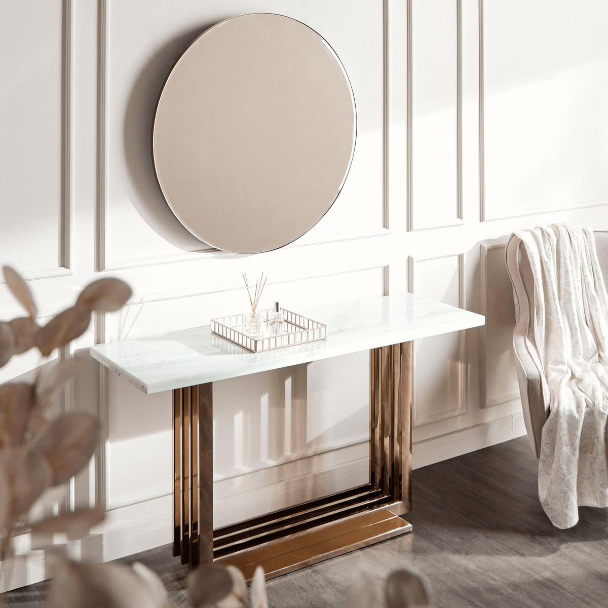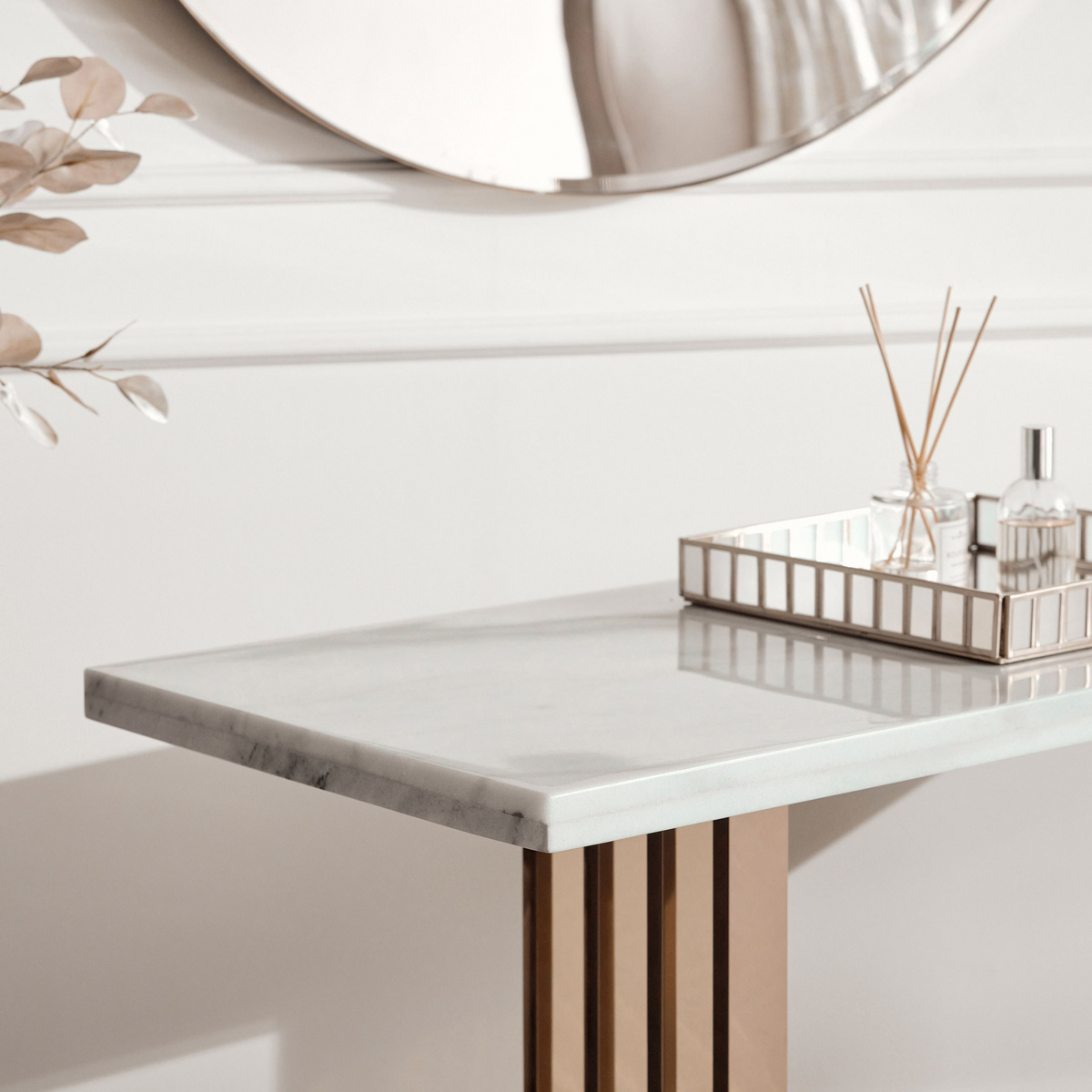 امنح مساحة معيشتك لمسة ملكية باقتناء طاولة كونسول الجذابة هذه. تأتي بمرآة وتشطيب رخامي ومصقول يعزز من جاذبية التصميم، كما أنها مصنوعة من المعدن المتين الذي يعزز من جودتها؛ امسحيها برفق للاعتناء بلمعانها.