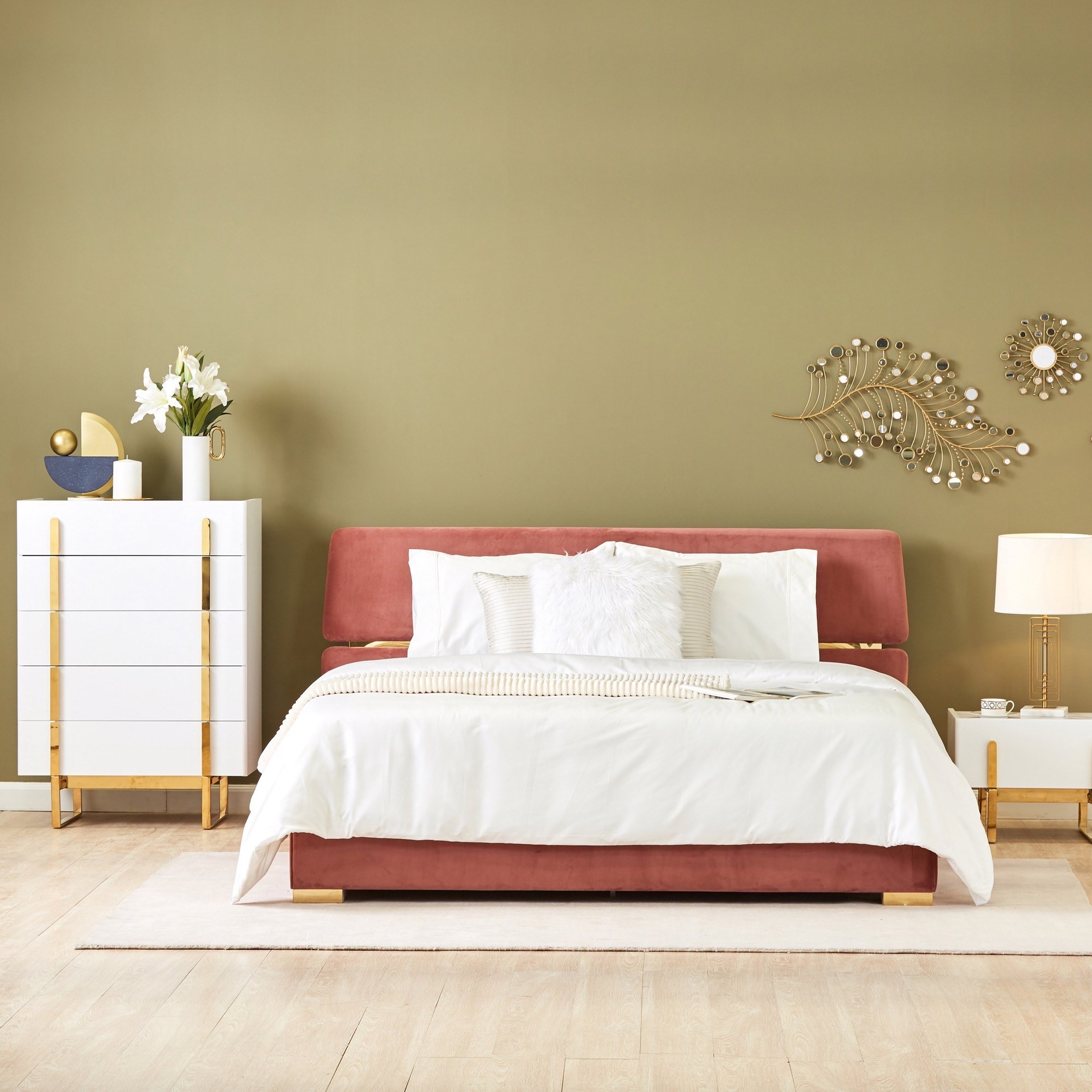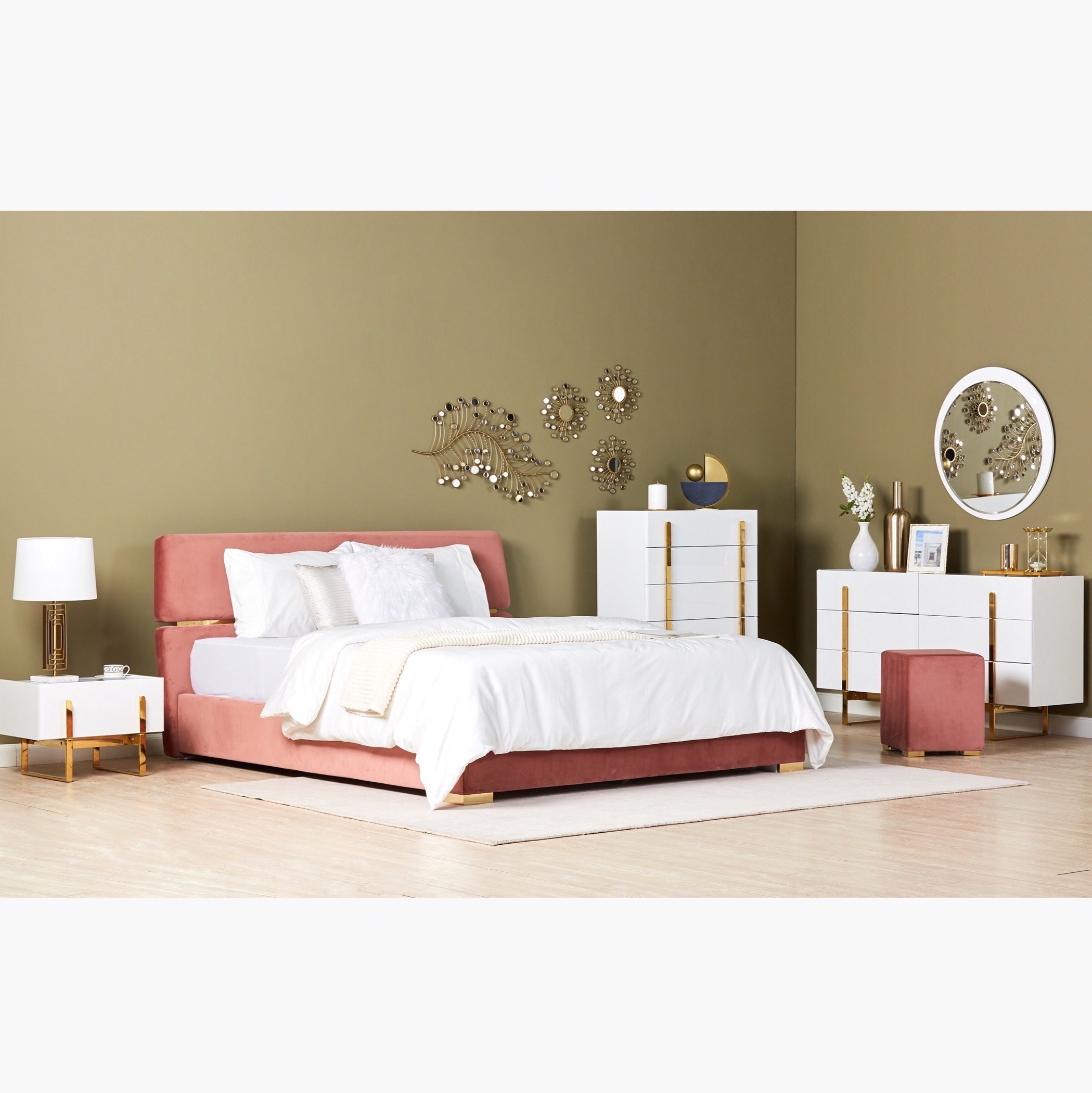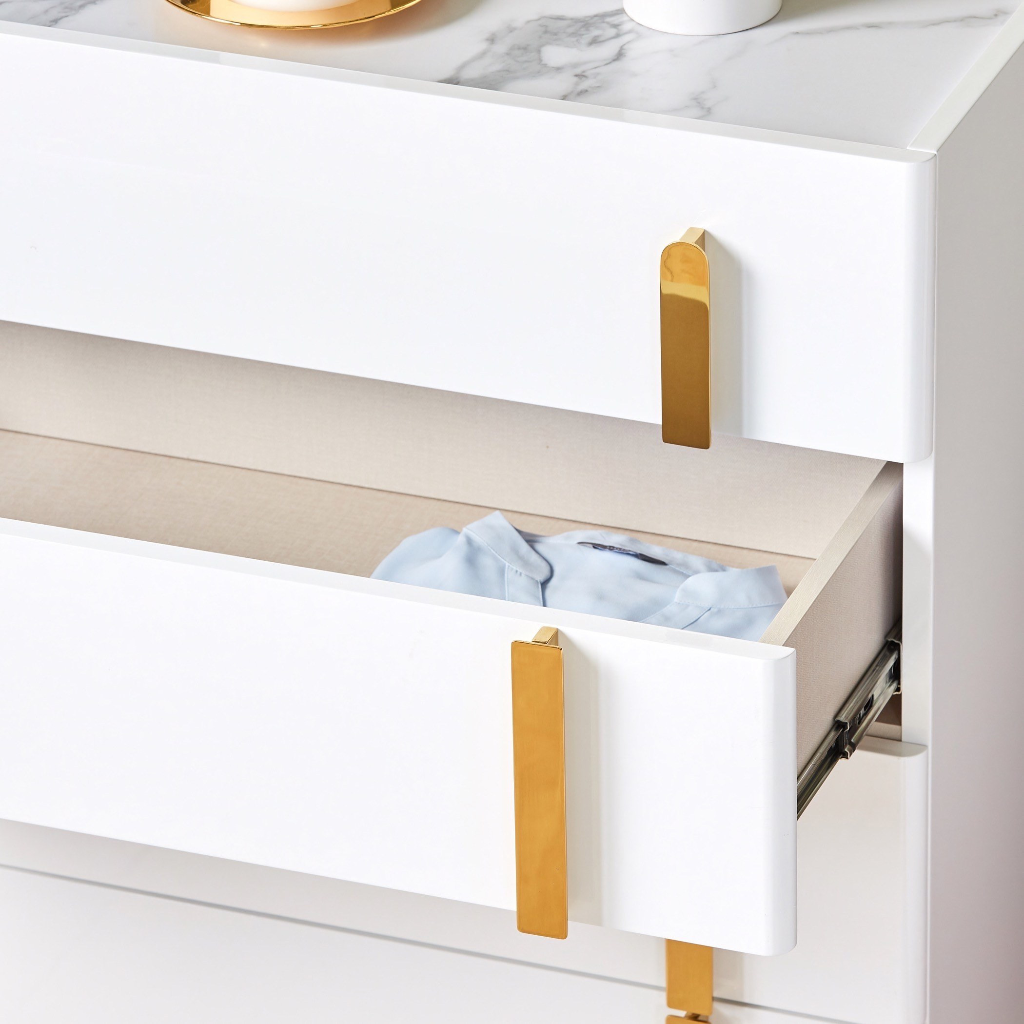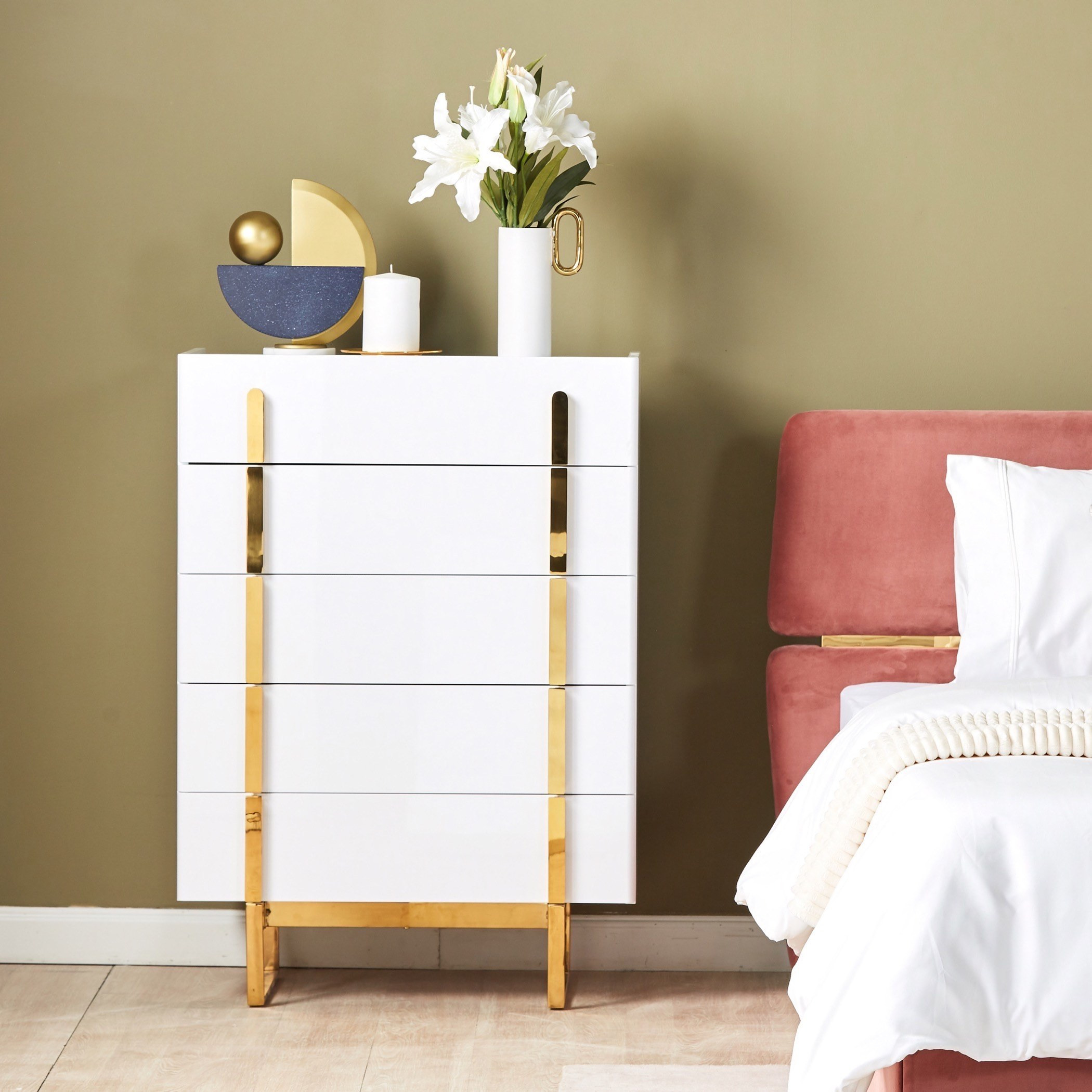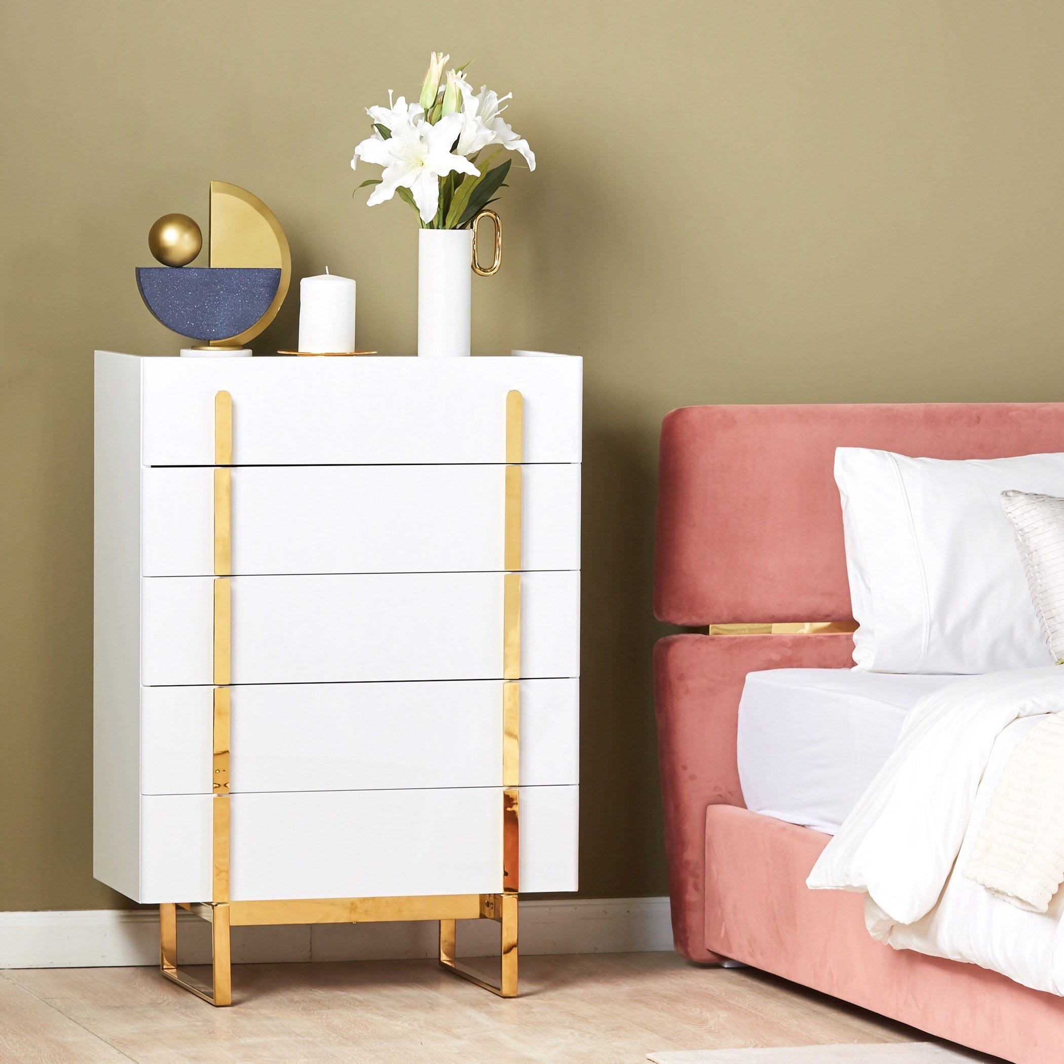 أضيفي لمسة ترتيب وأناقة إلى ديكور غرفة النوم باقتناء وحدة التخزين الرائعة هذه، تأتي بتصميم جذّاب مع 5 أدراج لتخزين أغراضك بشكل متقن، وتتميّز بخاماتها المتينة من الخشب الهندسي مع تشطيب ورنيش وسطح من الرخام الصناعي يزيدها سحرًا. تنظّف بسهولة وتستحق الاقتناء.