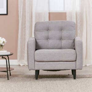 تمتّعي بالراحة الكاملة في غرفة معيشتك باقتناء هذا الكرسي الأنيق. مصمم بإطار من الخشب الهندسي المتين، وبنمط معنقد أنيق بتصميم مخملي، ومسند ظهر كثيف مع مساند ذراعين مربعة جذابة، وبتنجيد ناعم، وبحشو من الإسفنج والألياف. مريح للغاية ويمكن تنظيفه بالطريقة الاحترافية للحفاظ عليه.