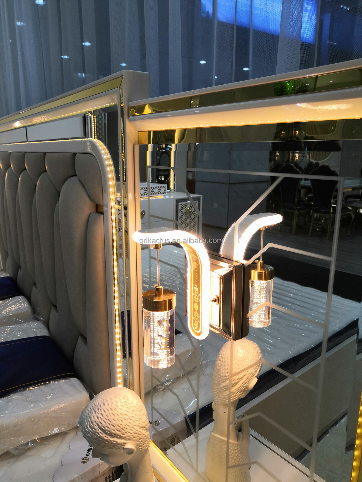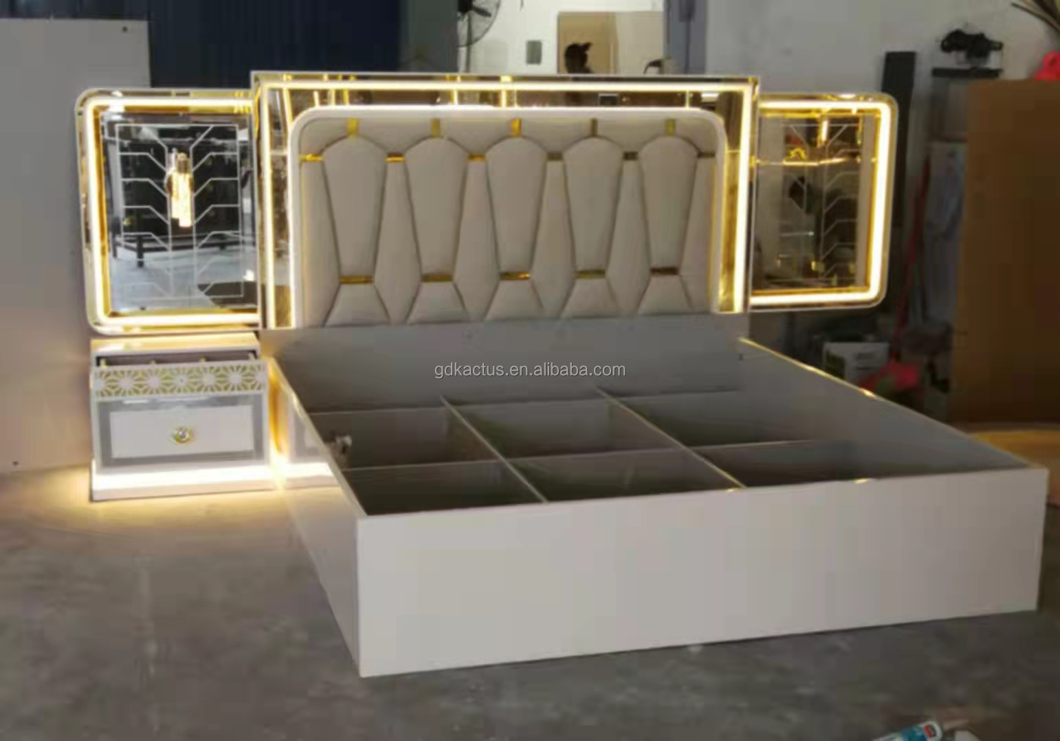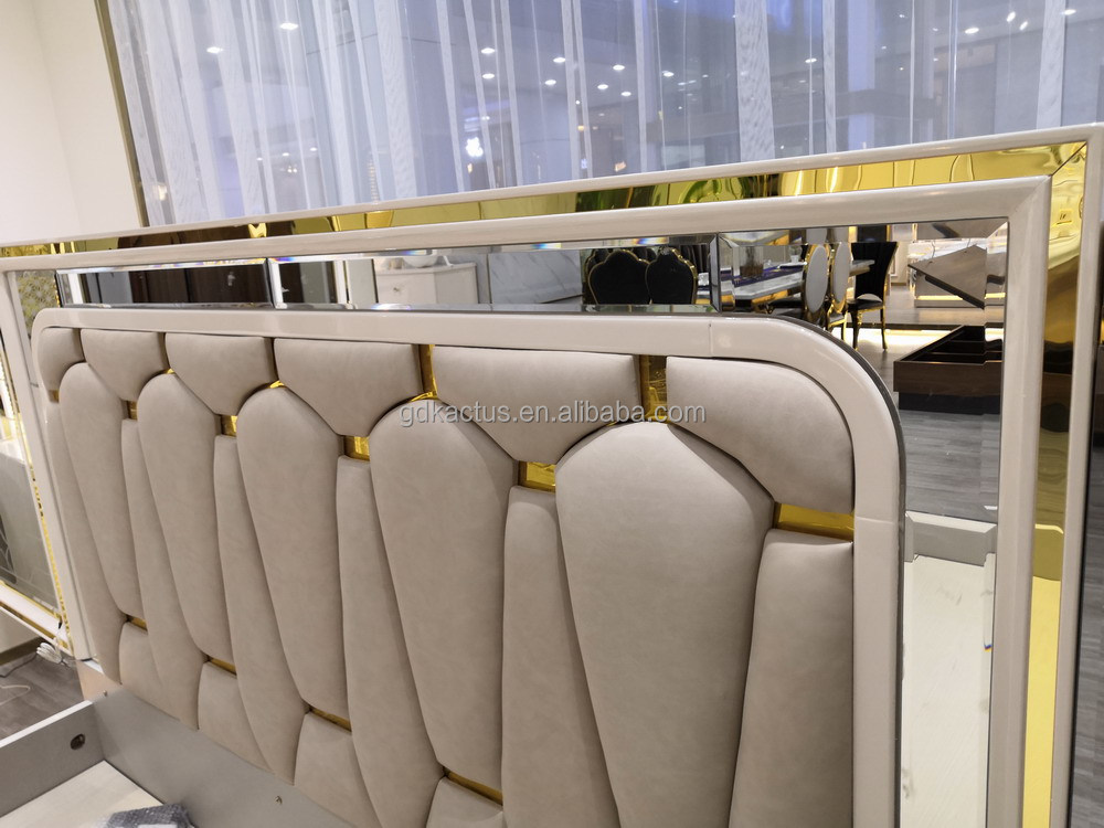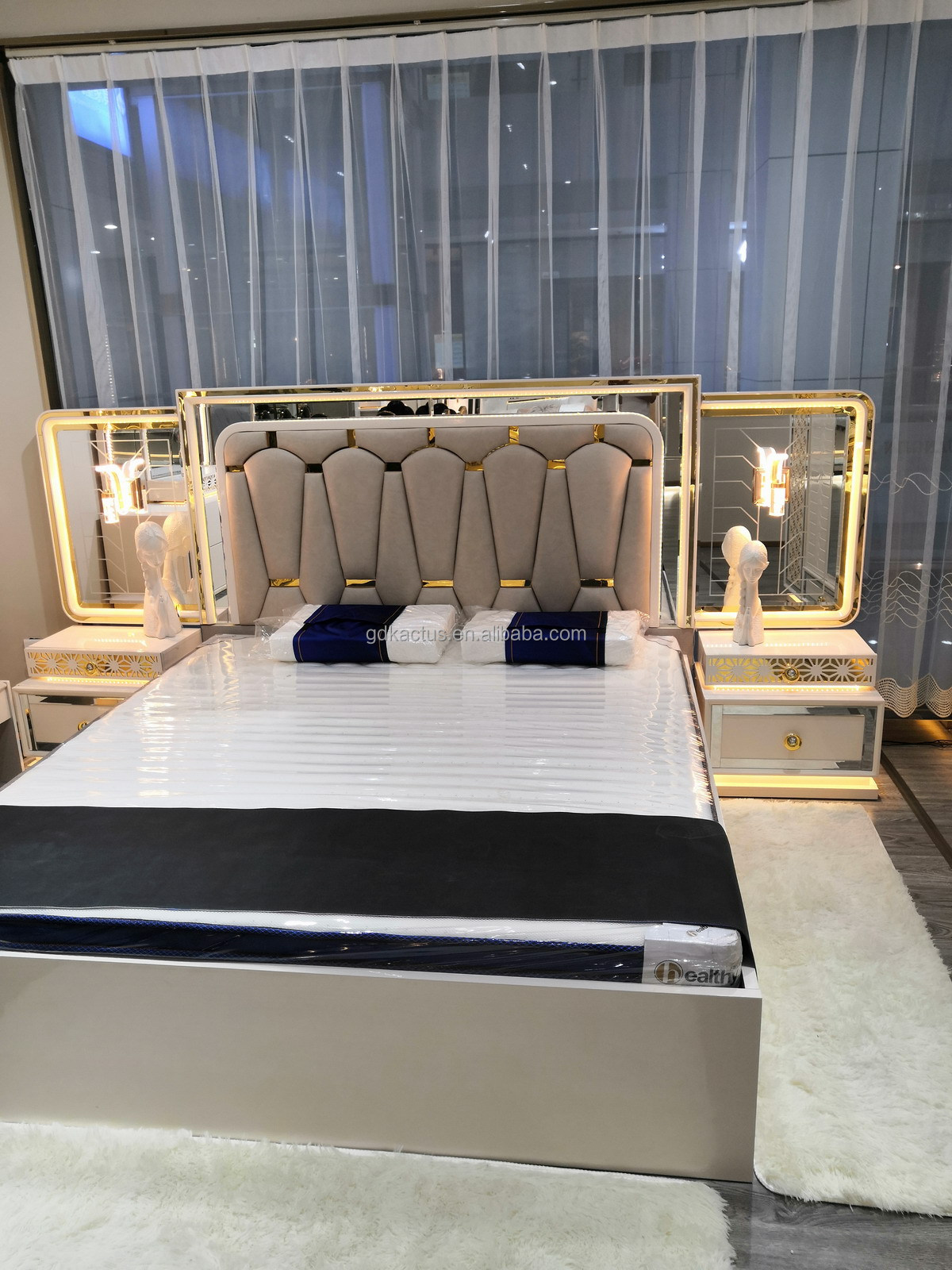 تم تصنيع كل جزء من هذه الغرفة باستخدام مواد عالية الجودة، حيث يتميز الخشب الهندسي وخشب الزان الروماني بالمتانة والأناقة. تضفي اللمسات النهائية الفاخرة من الستيل المذهب والزجاج المقاوم للصدمات لمسة من التألق. يأتي الجلد المغطى بالإسفنج عالي الكثافة لتضمن الراحة الفائقة. تكمل الإضاءة الليد المحيطة بالتصميم الجمال والأناقة العصرية.