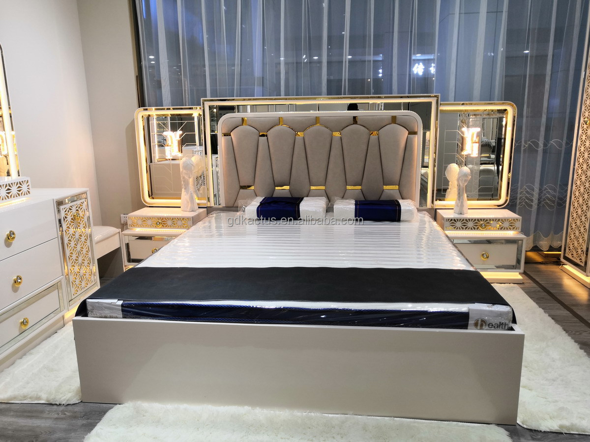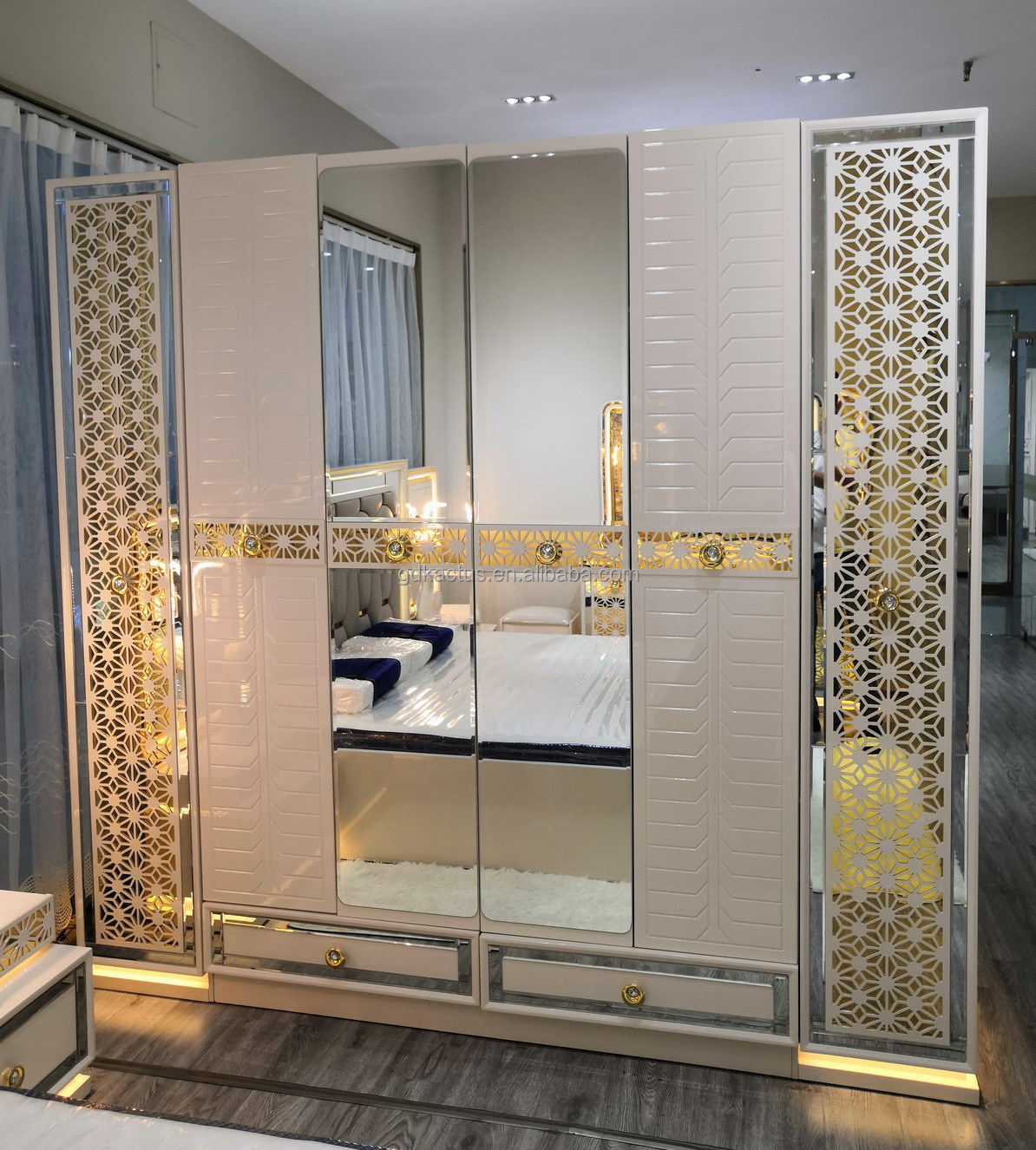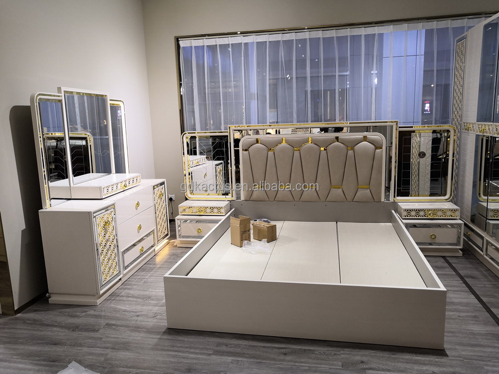 غرفة نوم كاملة بتصميم فخم مكونة من سرير فاخر مع 2 كمودينة جانبية للسرير و خزانة ملابس كلاسيكية فخمة و تسريحة شيك