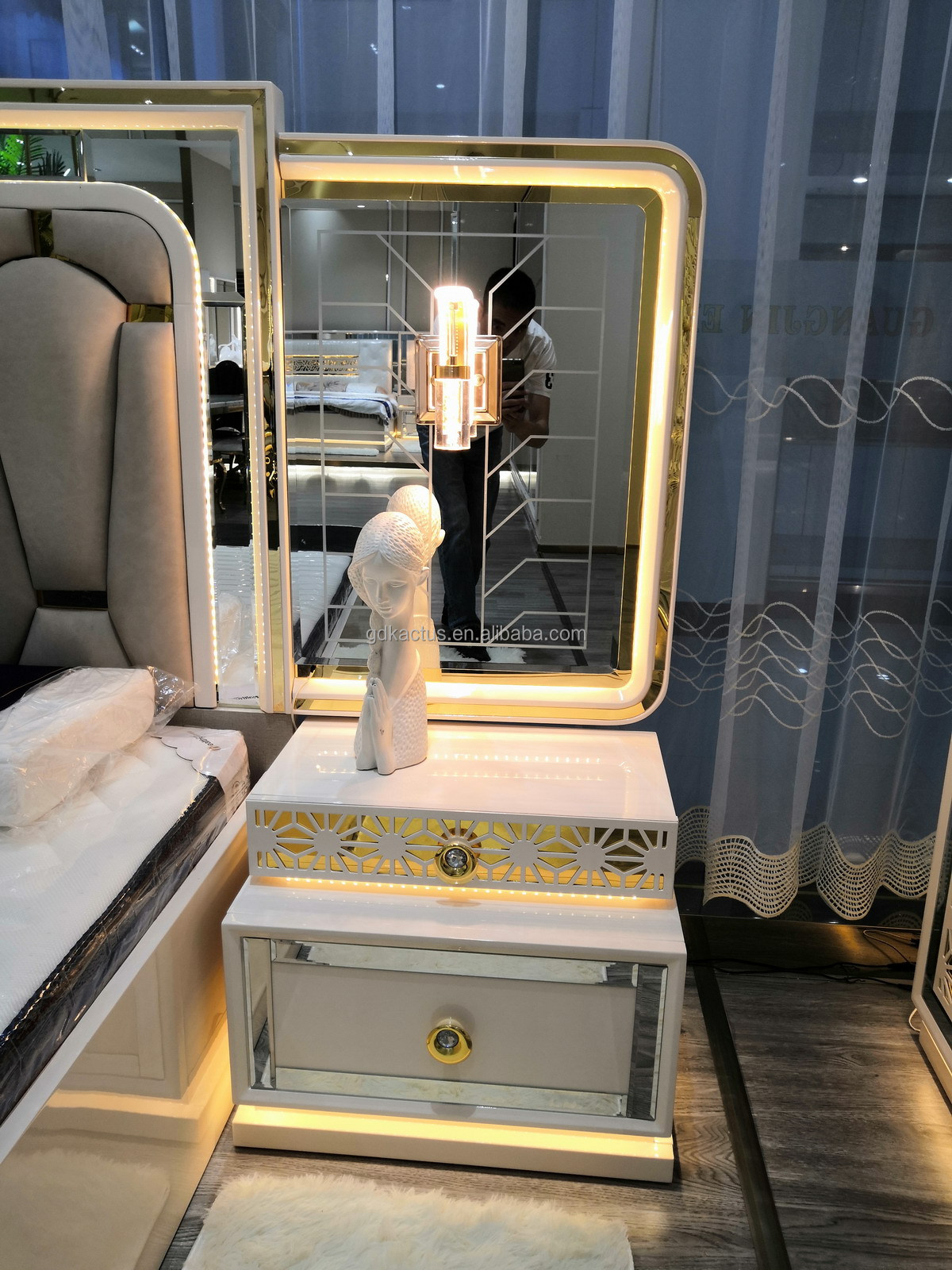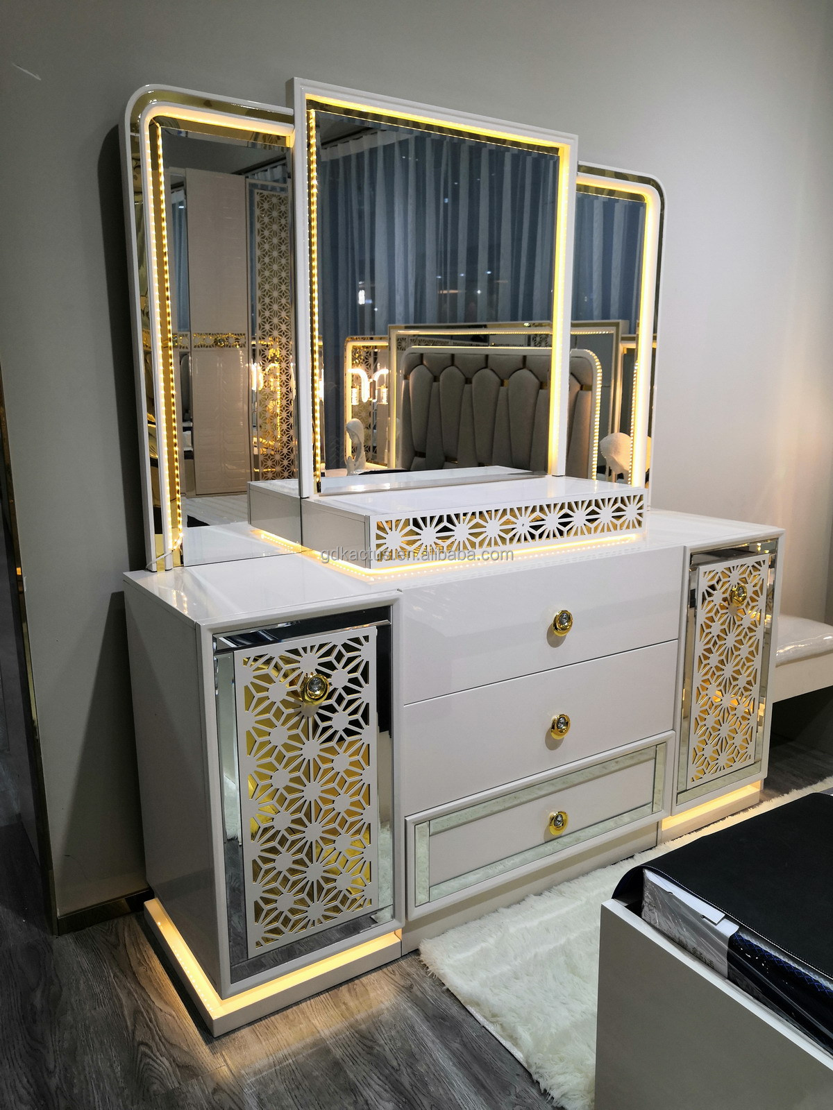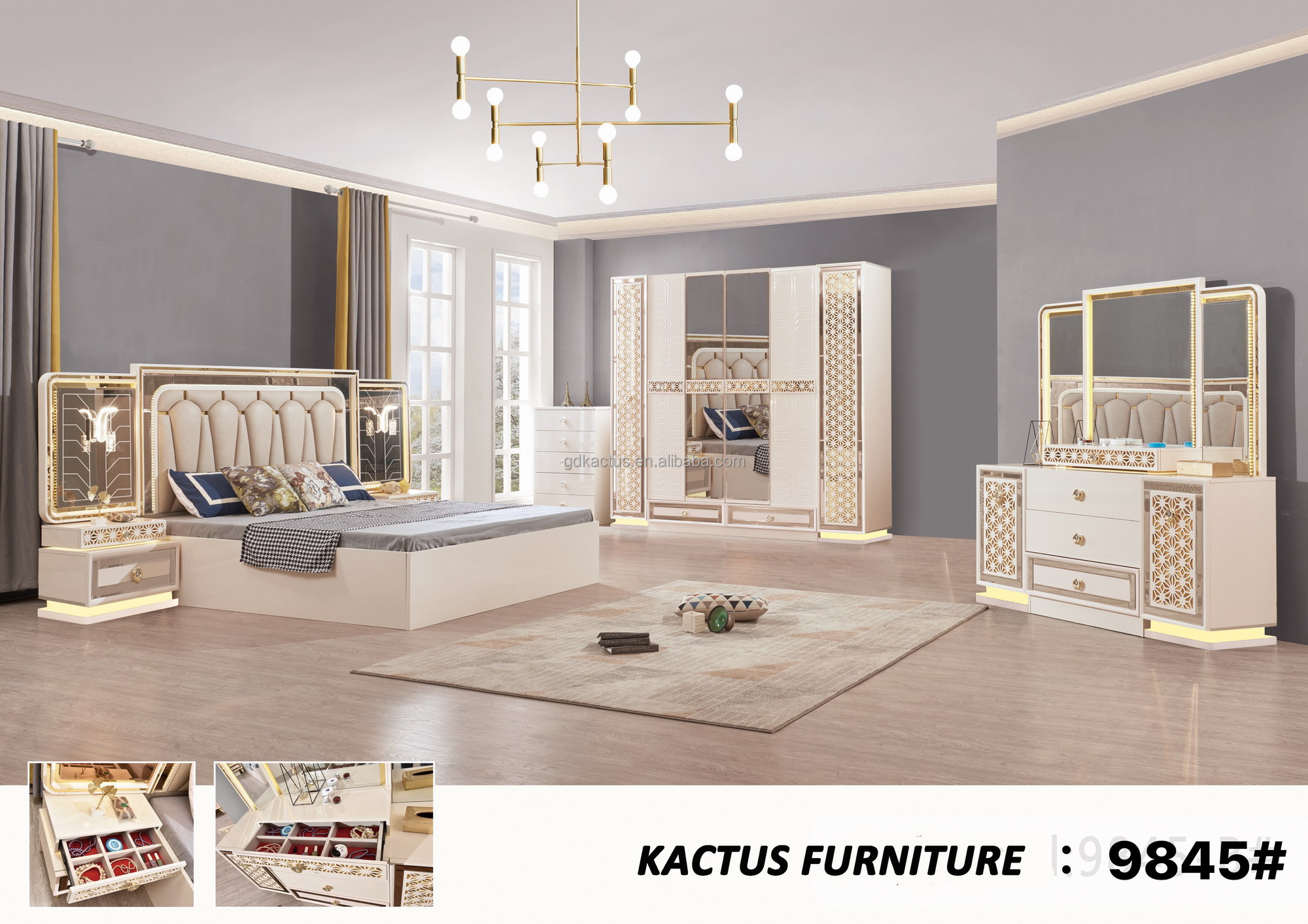 غرفة نوم كاملة بتصميم فخم مكونة من سرير فاخر مع 2 كمودينة جانبية للسرير و خزانة ملابس كلاسيكية فخمة و تسريحة شيك